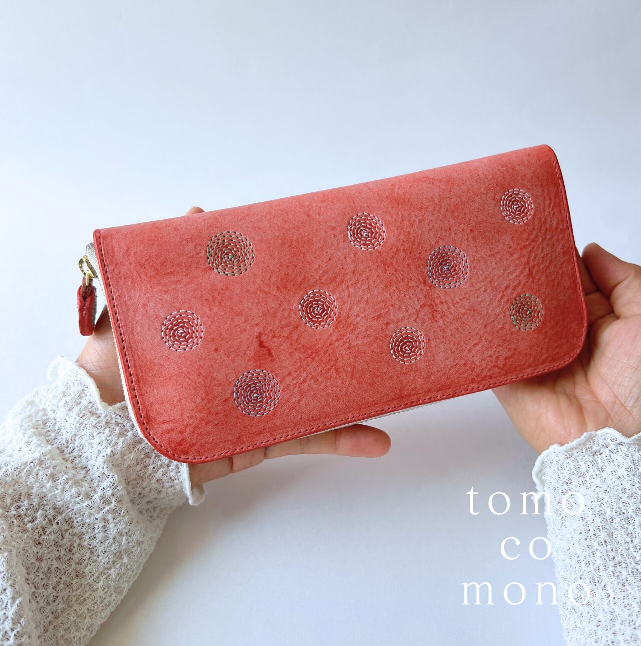 イタリアンレザー × 刺繍革財布『ぐるぐるmini』アラスカRED(牛革)長財布/ラウンドファスナー型