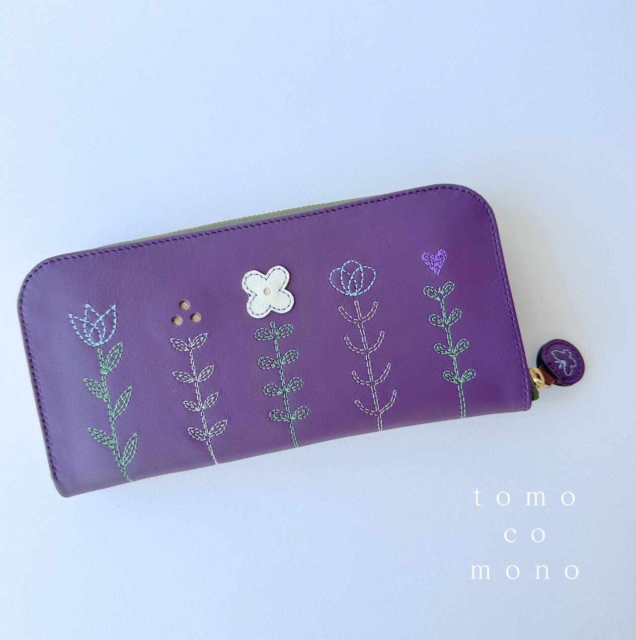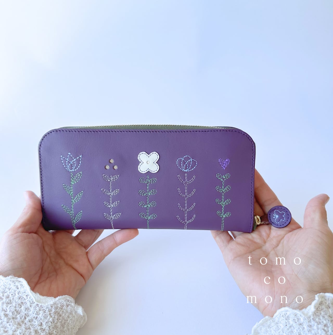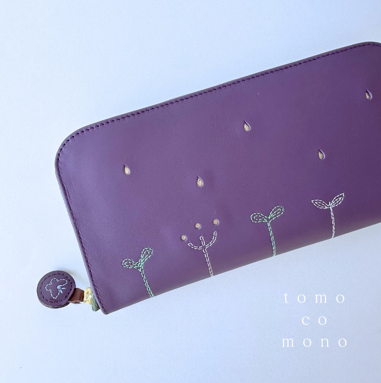 エコレザー × 刺繍革財布『LIFE』PLUM/パープル(牛革)長財布☆ラウンドファスナー☆