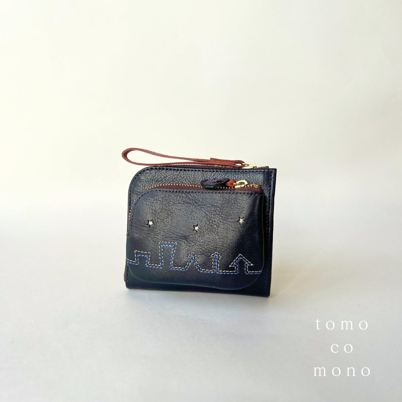 刺繍革財布『街』牛革 BLACK ☆コンパクト二つ折り☆