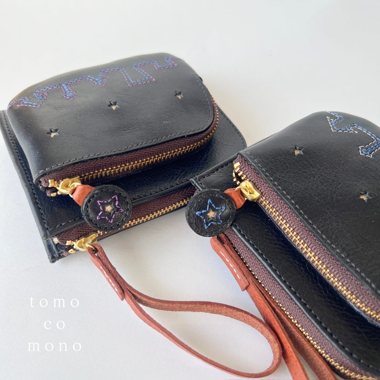 黒の牛革に、ブルー系、パープル系の優しい光沢のある糸で、