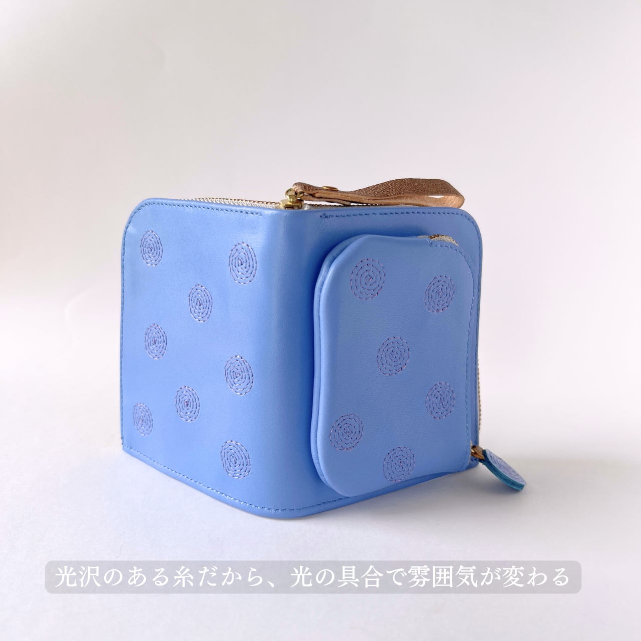 刺繍革財布『SHABON』はなだLightBlue(牛革)二つ折りミニ財布