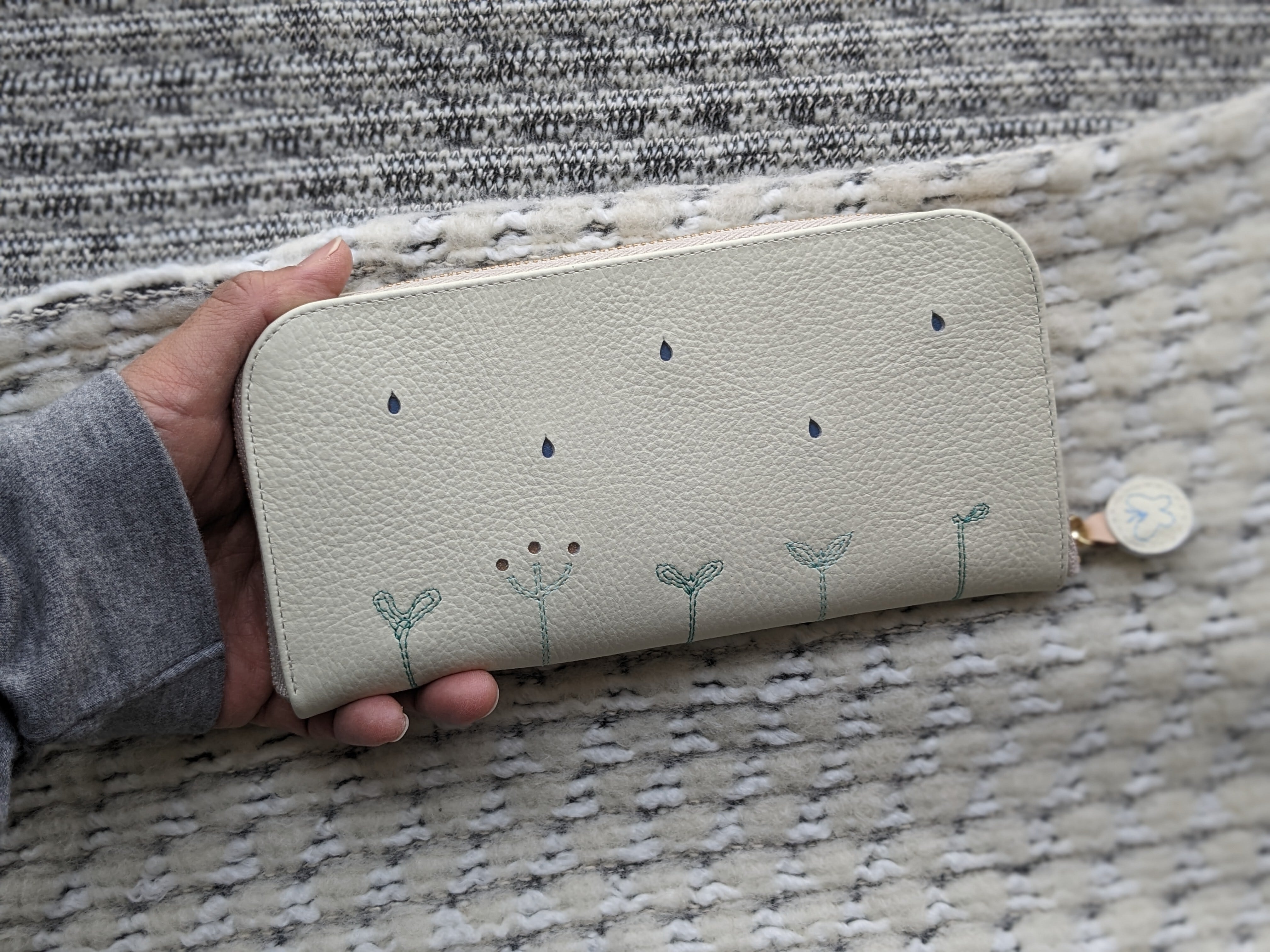 刺繍革財布『LIFE』ホワイトクリーム×ライトグリーン系2種(牛革)スリム型ラウンドファスナー