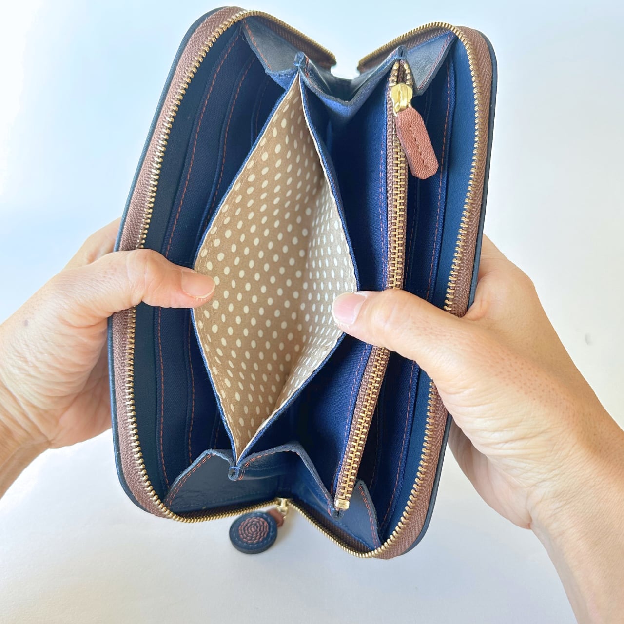 刺繍革財布『SHABON&bear』NAVY(牛革)ラウンドファスナー☆「青」or「赤」☆